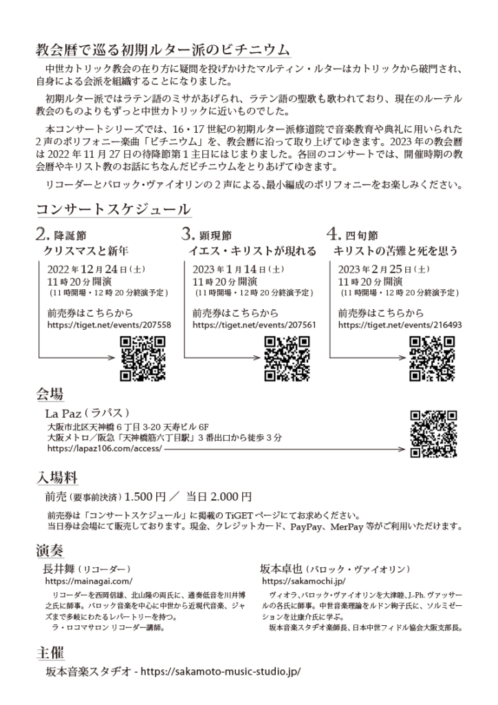 長井 舞 (リコーダー)と坂本卓也(バロック・ヴァイオリン)が、教会暦や聖書の話を交えながら、ひたすら「四旬節」にまつわるビチニウムを演奏します。